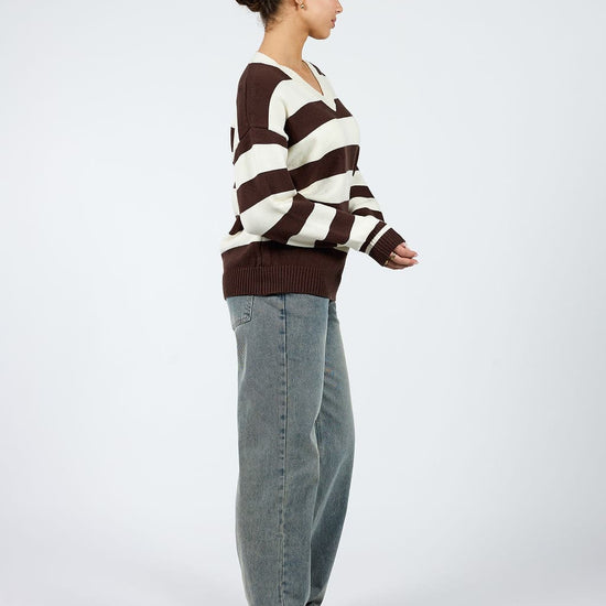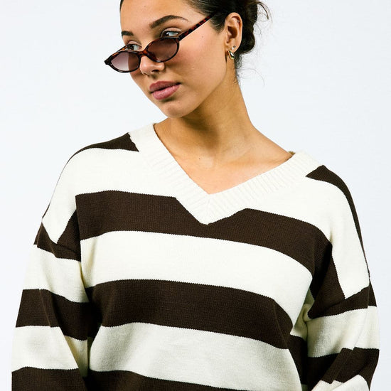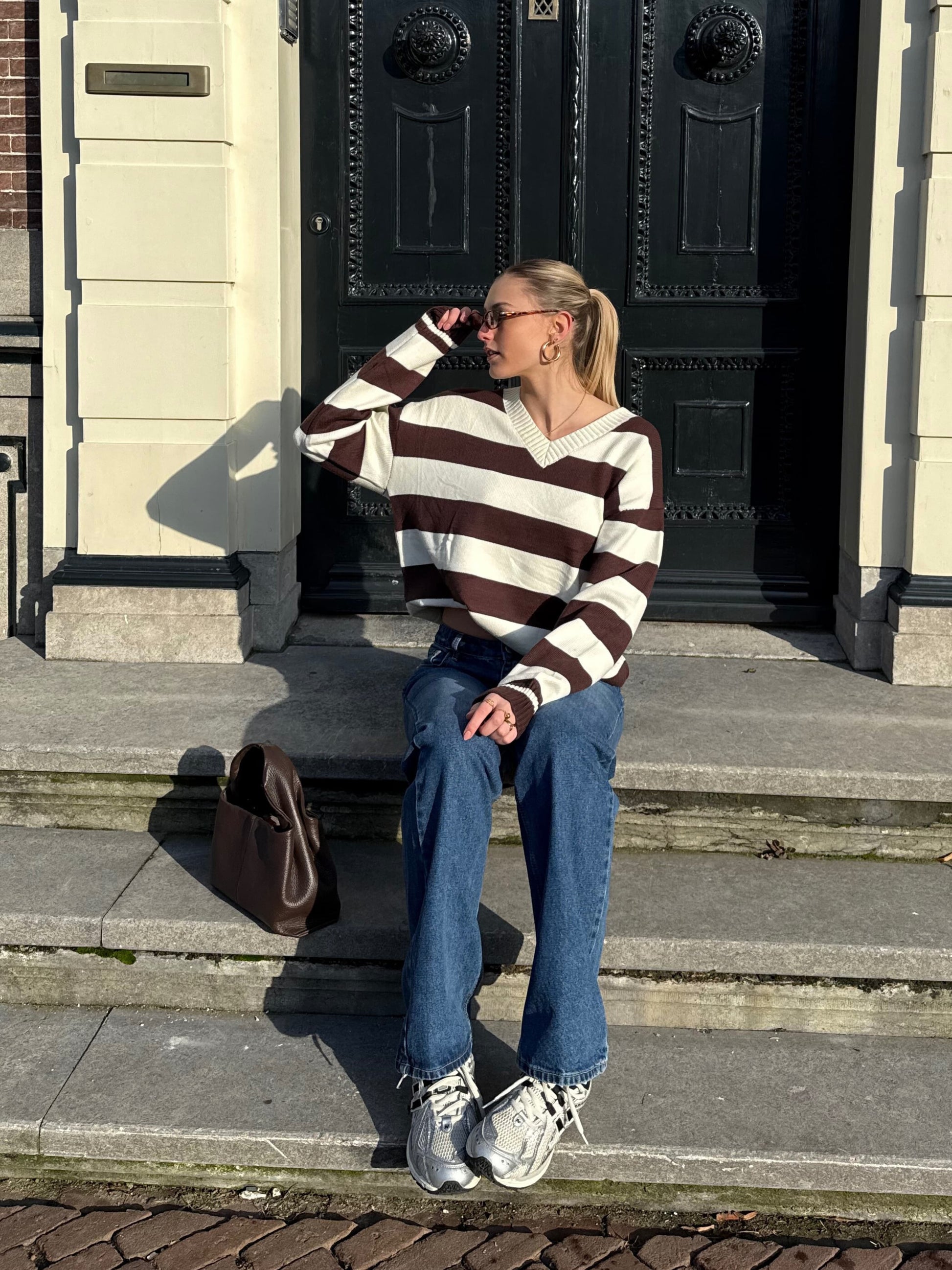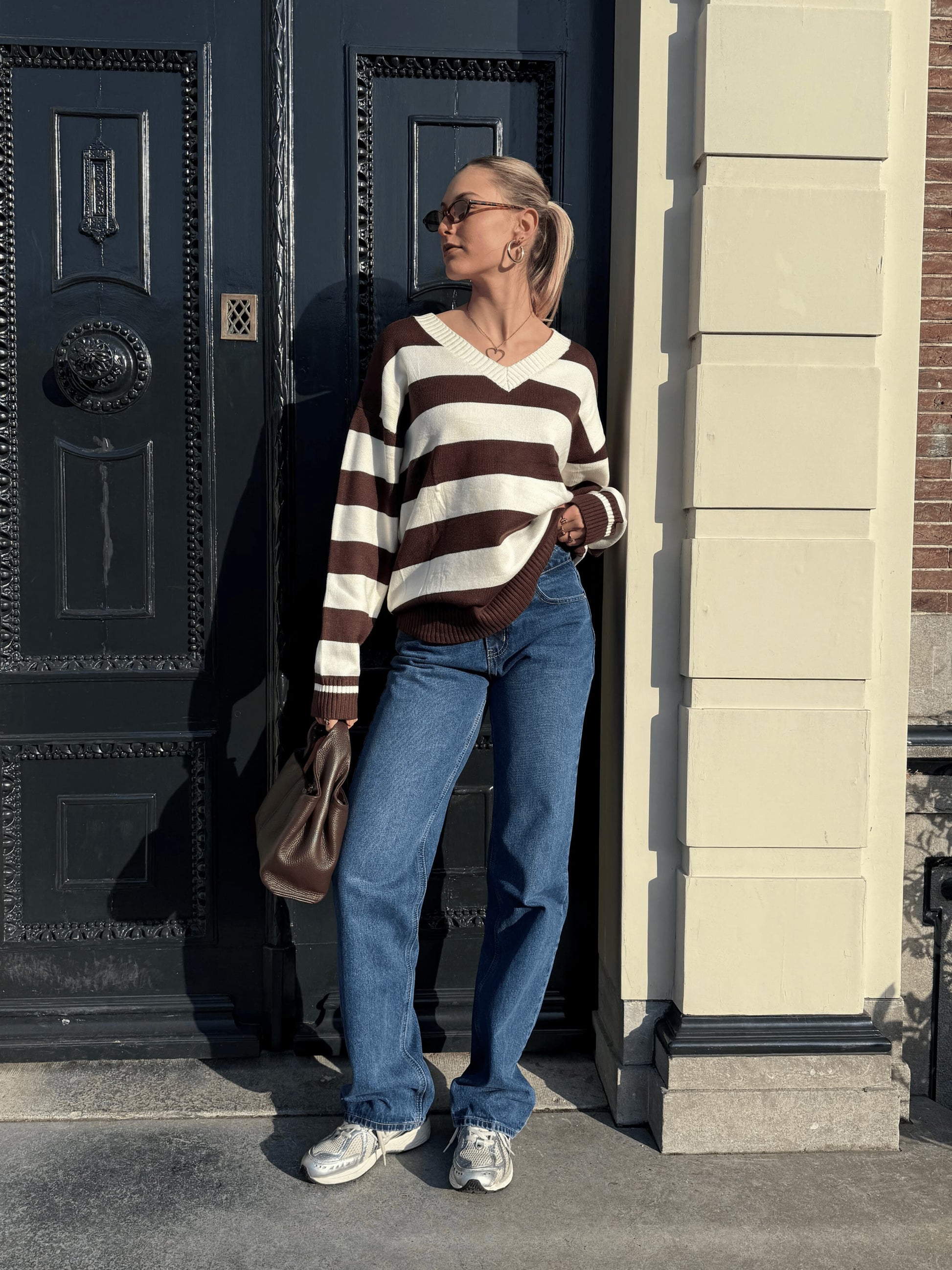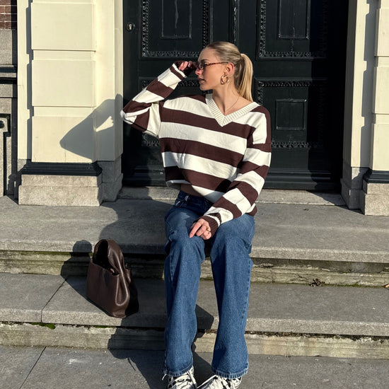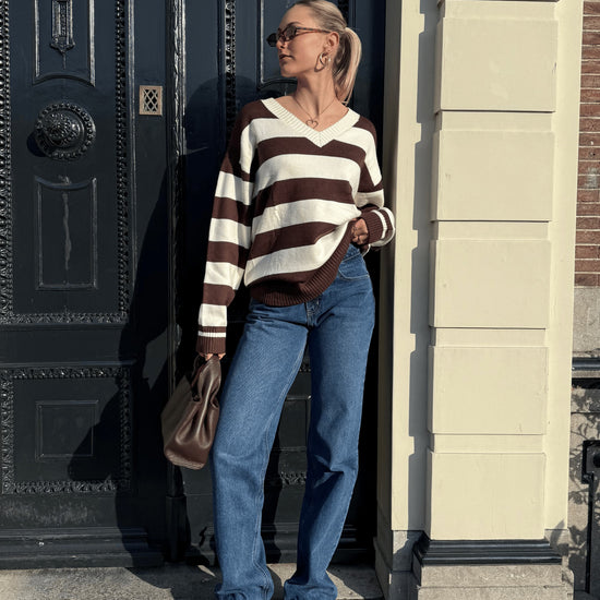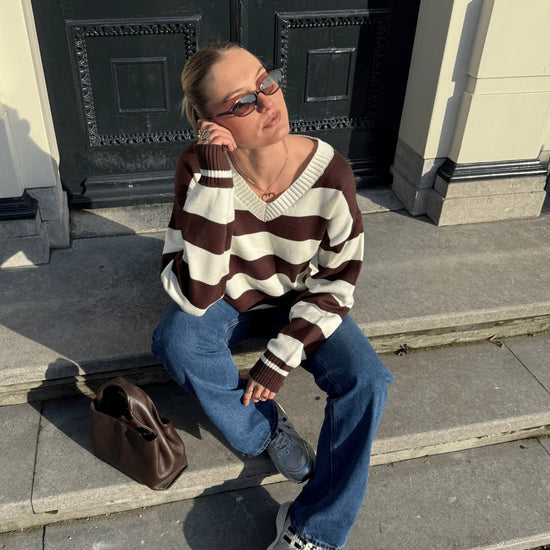 The Ella knitted sweater is one of those pieces that instantly makes you happy. A new favorite in our knitwear collection, it perfectly combines comfort and style. The sweater features a playful stripe pattern and a beautiful V-neck. The fabric feels wonderfully soft, and the slightly oversized fit creates a relaxed and comfortable look.