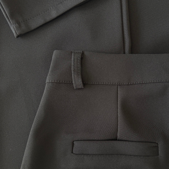 Details: The trousers have no pockets, a straight fit, and close with a zipper and button. There are two decorative back pockets. The fabric has a slight stretch.