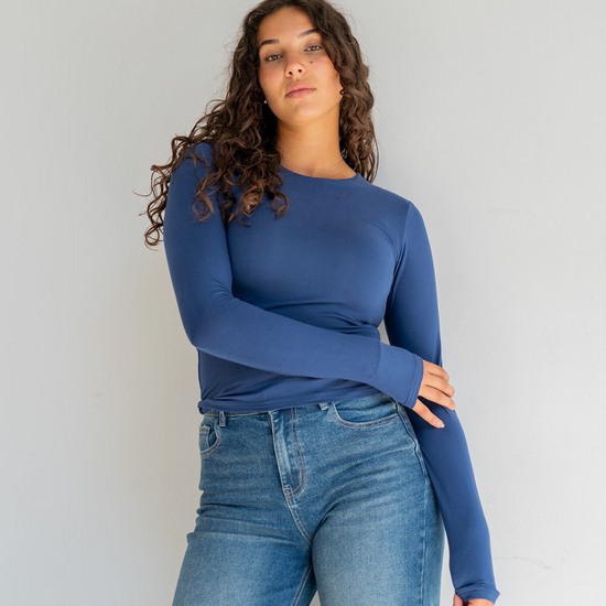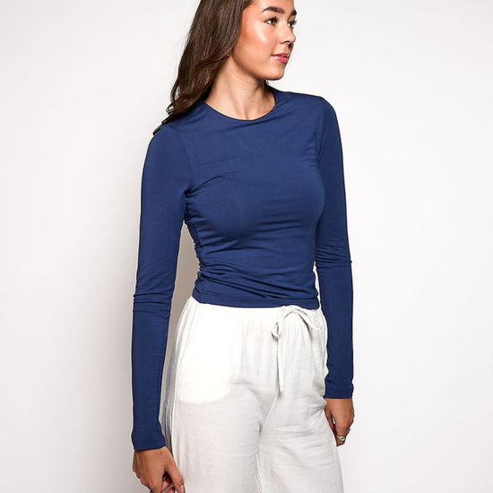 The Lexie Long Sleeve Top in navy is a stylish basic with a twist. The deep color makes it just a little bit different than your standard basic. The top has a double layer at the torso so it is not see-through, and is made of wonderfully soft fabric. With extra long sleeves and two length options, this is the ultimate tall girl essential for every day!