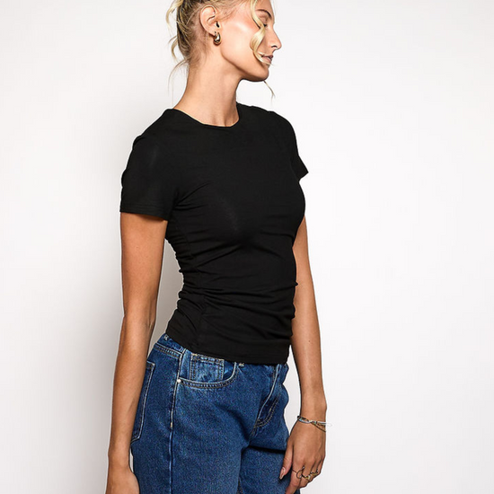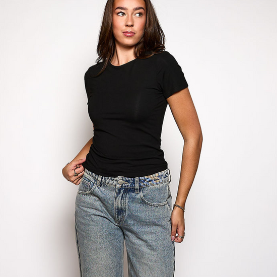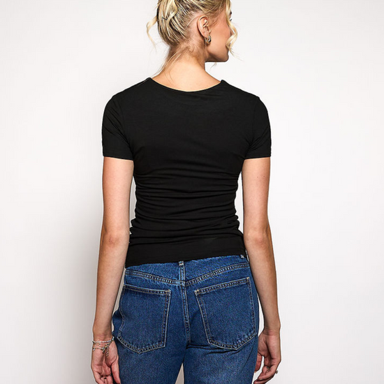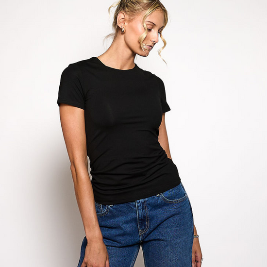 The black Lexie Short Sleeve Top is a perfect basic with a luxurious feel. Crafted from super soft fabric, it features a double-layered torso for opacity. The fit is tailored specifically for tall girls and falls beautifully long. A versatile piece that can be styled endlessly, from casual to classy.