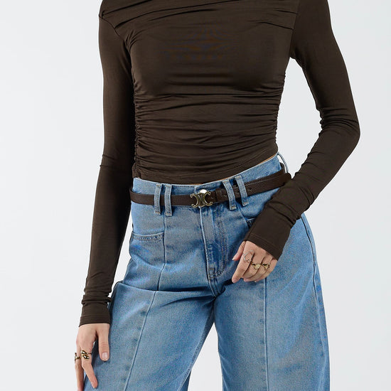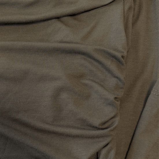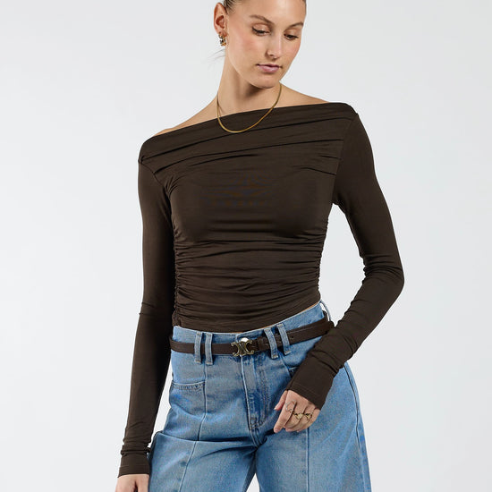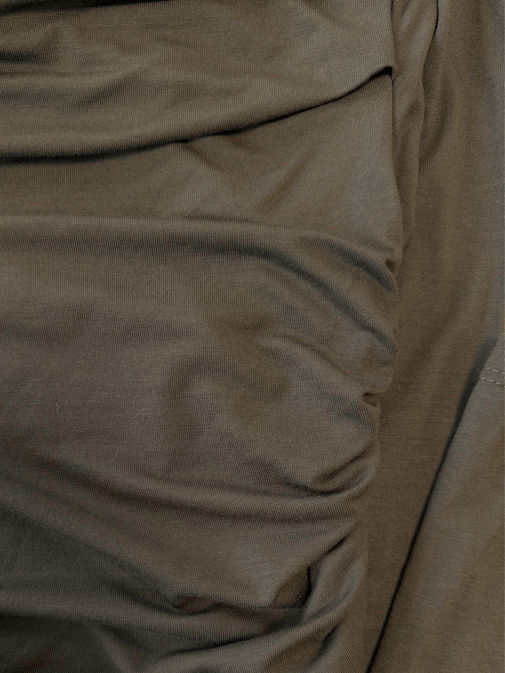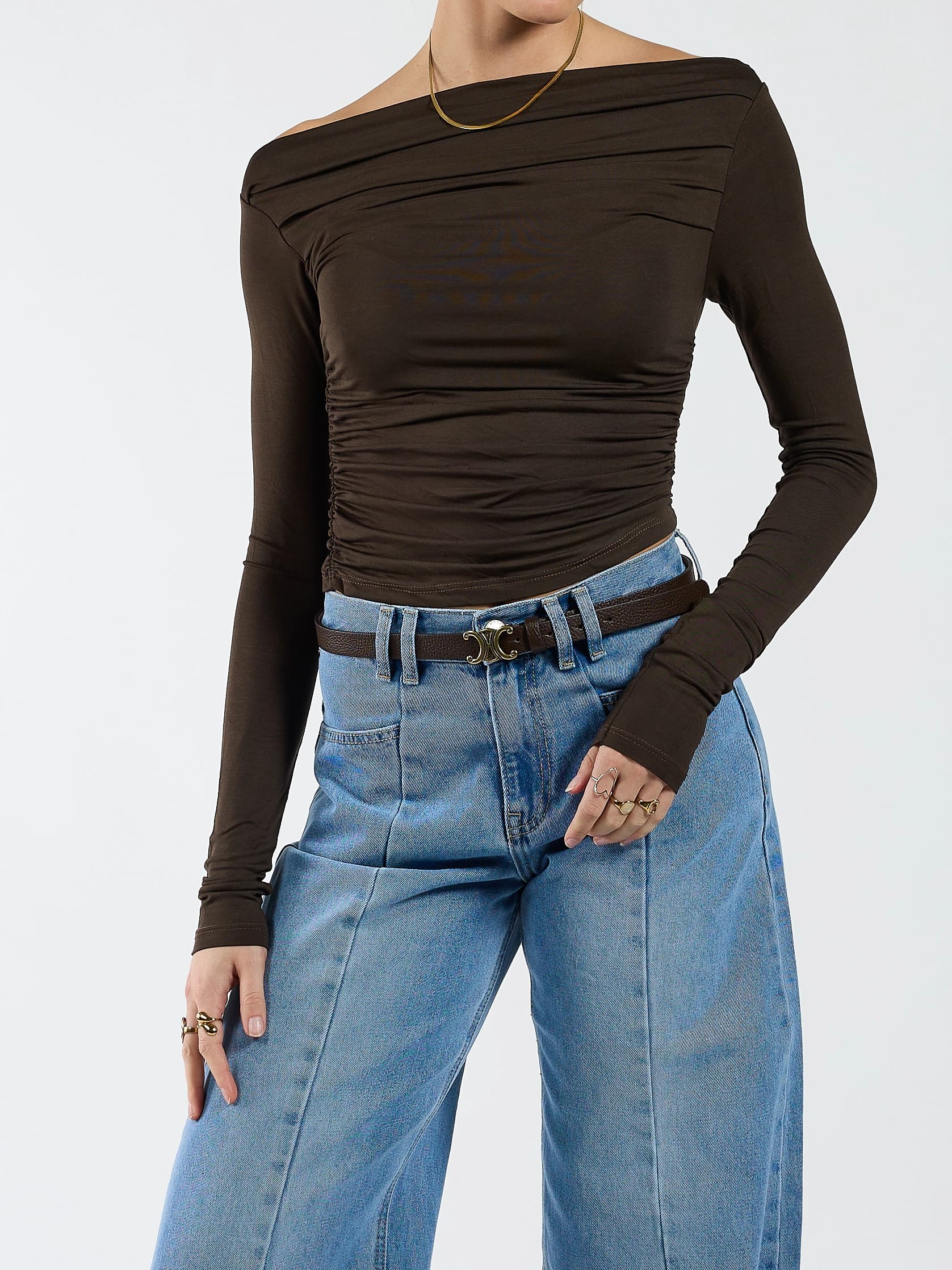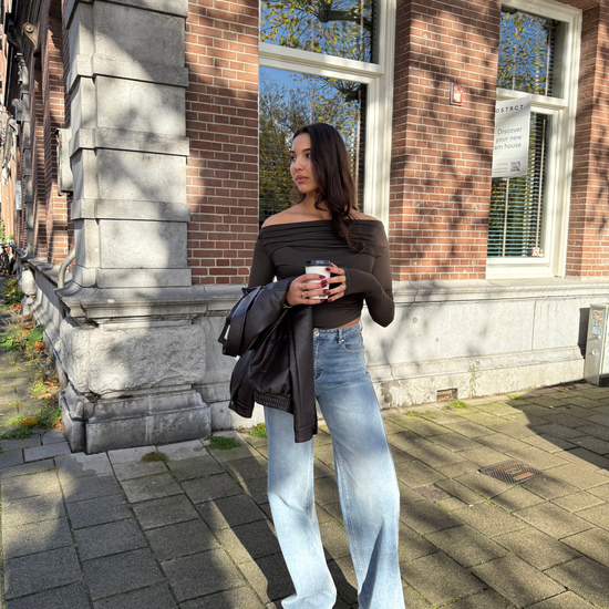 The top can be worn off shoulder and has subtle ruffles on the sides for a flattering effect. The fit is slightly asymmetrical, which creates a playful and feminine look. The pleats in the fabric allow you to style the top as desired!