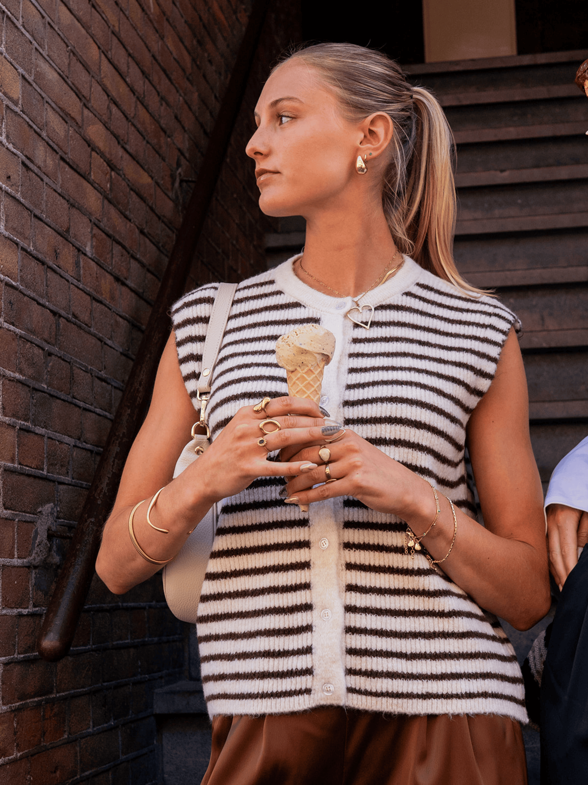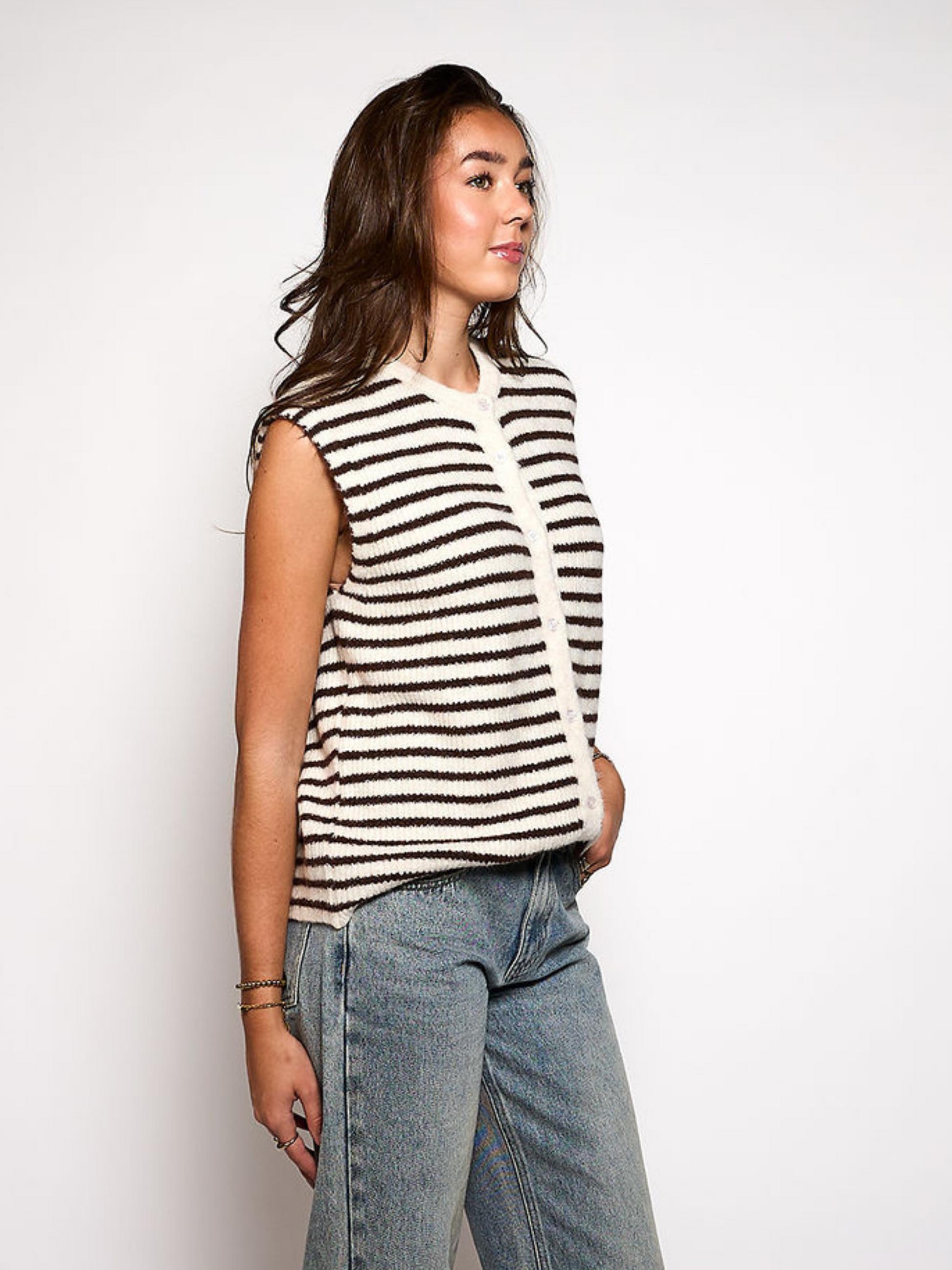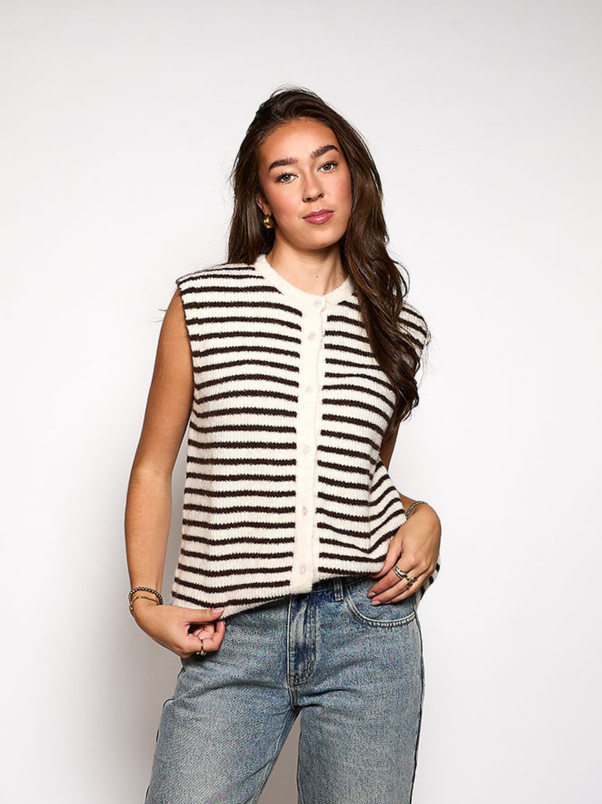 This sleeveless cardigan is made of a soft knit fabric and fastens with stylish buttons at the front. Wear it open over a top or closed as a knit top. The Lola is super versatile and pairs perfectly with your favorite jeans or trousers.