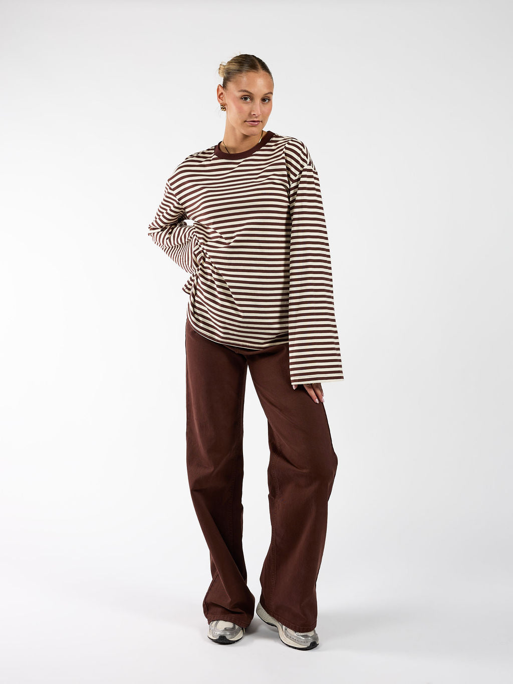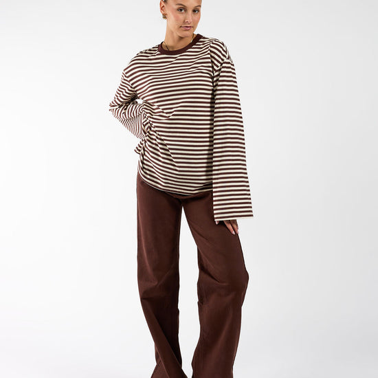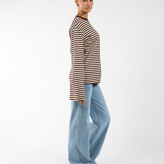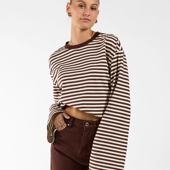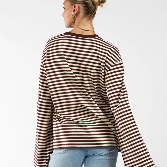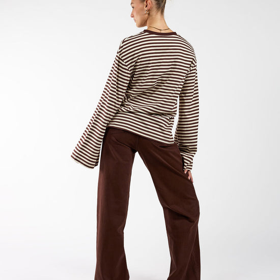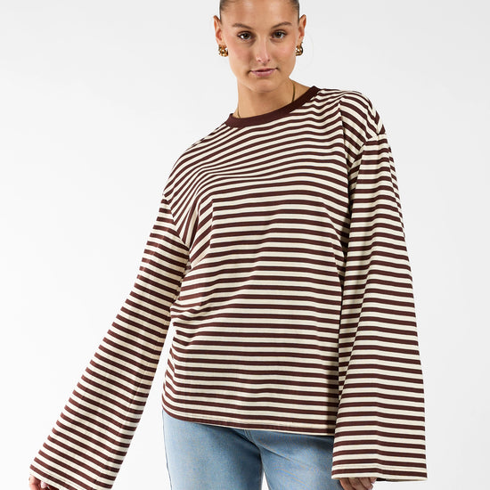 This cream and brown striped tee is a must-have for your tall wardrobe. Made from a soft, comfortable fabric, it features extra-long, wide-sleeved details for a playful, feminine touch.