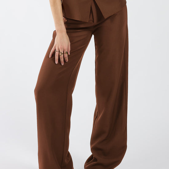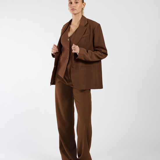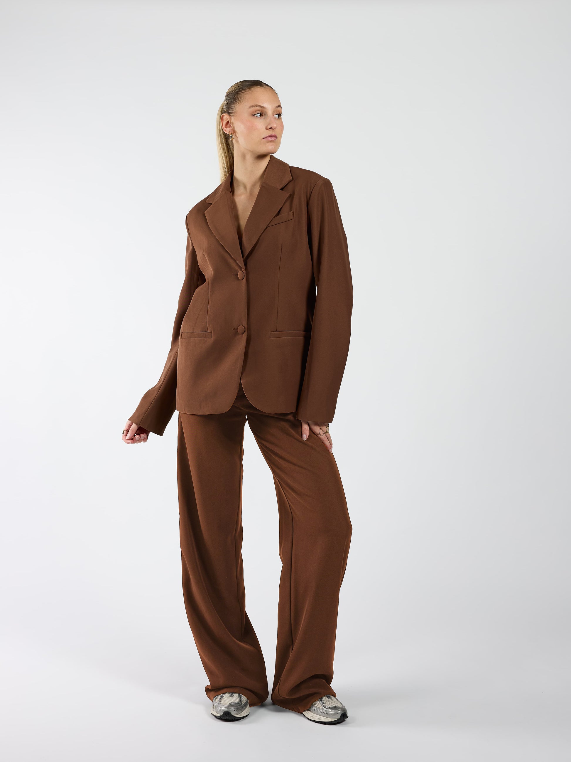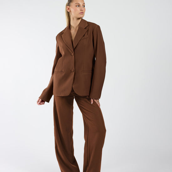 The Nova Suit in brown is the ultimate power suit that effortlessly combines style and comfort. The rich brown hue is the trend color of the season and gives the set a modern, warm, and stylish look. The high-quality fabric drapes beautifully and wears comfortably, while the fit is perfect. The trousers close with a button and zipper.