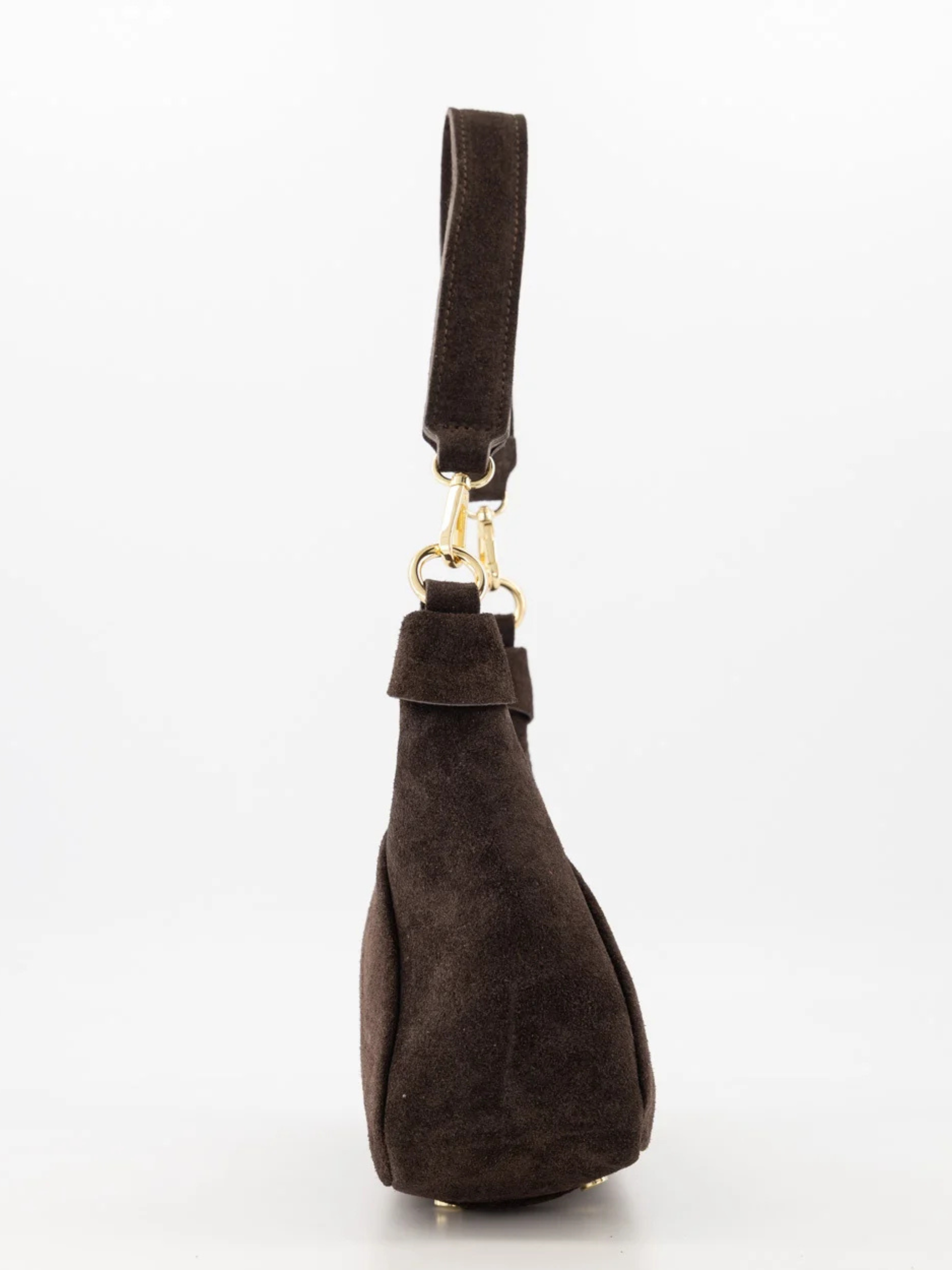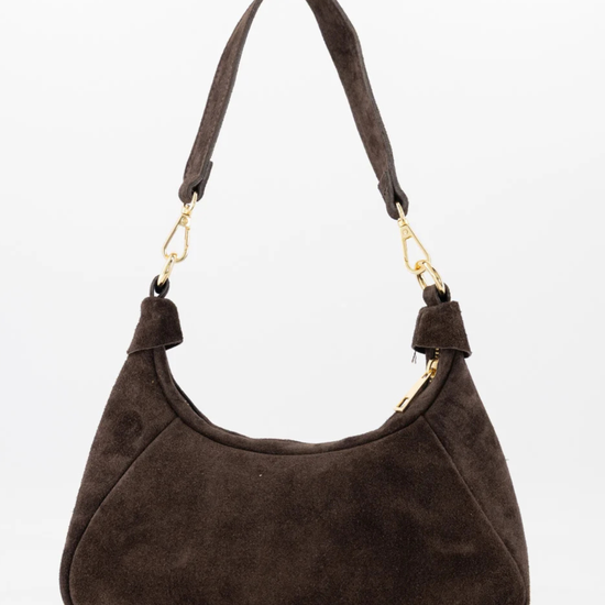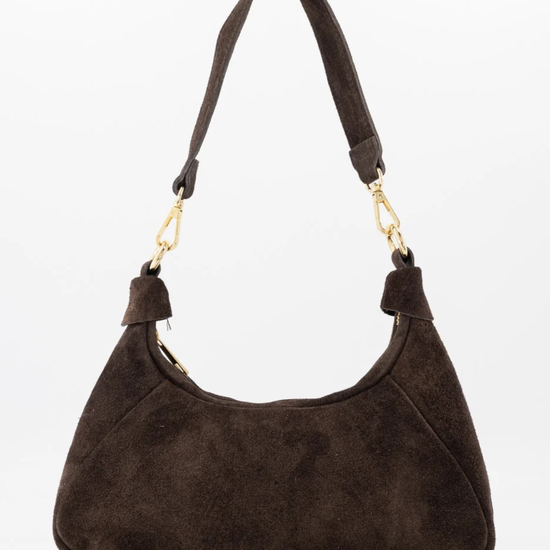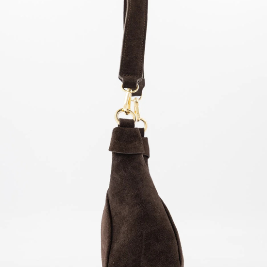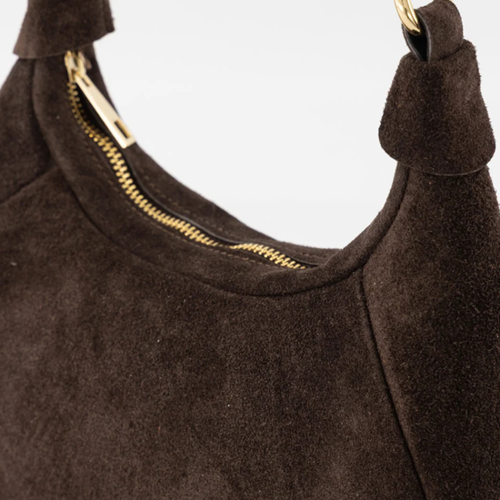 The Vanya bag is an elegant shoulder bag made of soft suede leather in a warm dark brown color. The bag has a spacious main compartment with a closable inner pocket, perfect for storing your essentials. Thanks to the adjustable strap, you can wear the bag both crossbody and over the shoulder. The gold-colored details add a refined touch and make this bag a stylish addition to any outfit.